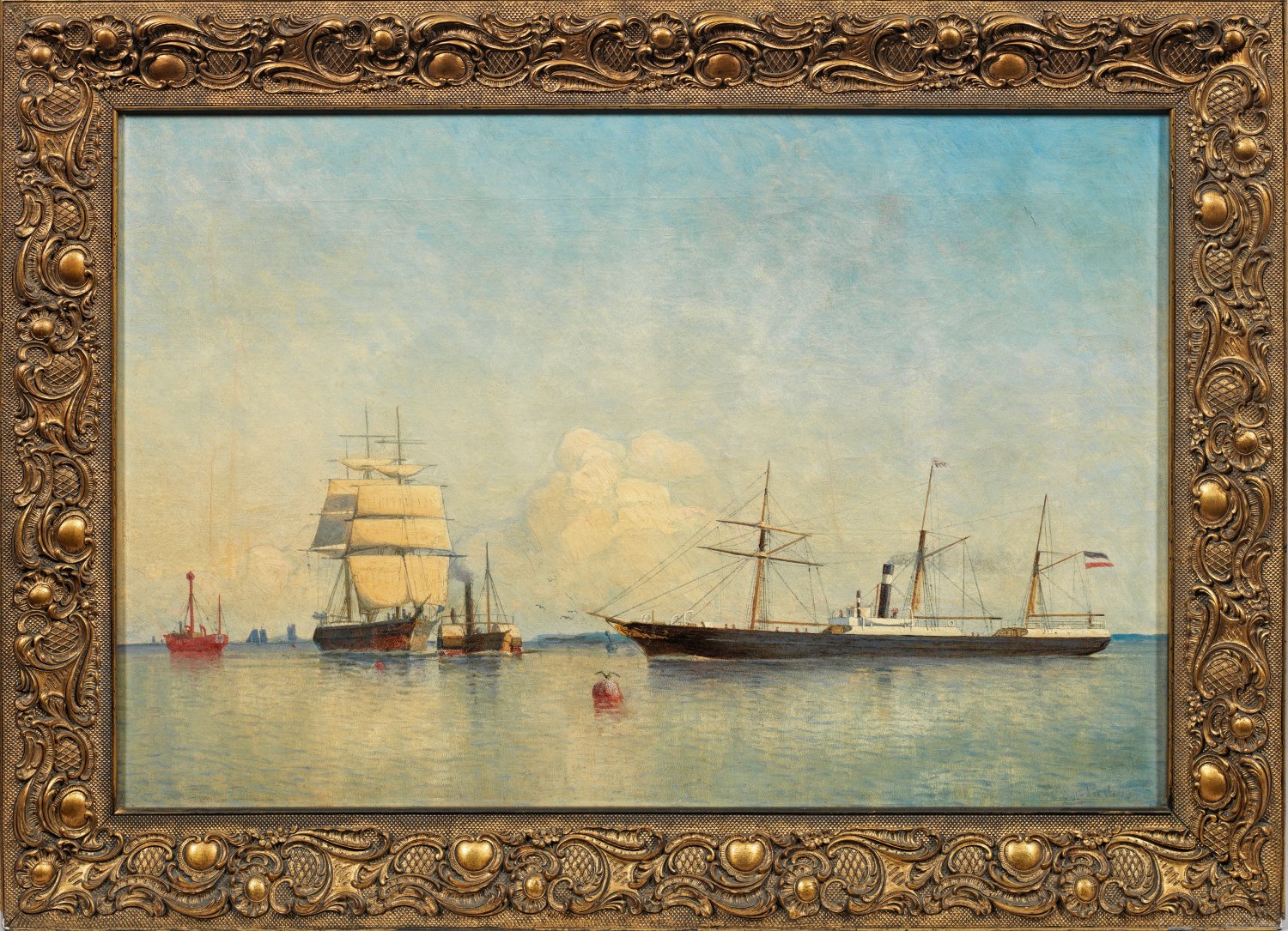 Stimmungsvolles Werk des Marinemalers, der einer alten Seemannsfamilie vom Stettiner Haff entstammte. Im Alter von 35 Jahren gab Parlow seinen Beruf als Seemann und Kapitän auf, um 1870-1874 die Kunstschule beim Marinemaler Hermann Eschke in Berlin zu besuchen. Danach kehrte Parlow nach Stepenitz zurück, verdiente seinen Lebensunterhalt mit Seefahrtsgeschäften und Malerei. 1891 und 1894 erwarb Kaiser Wilhelm II. Bilder von ihm. Öl/Lwd.; R. u. sign.; 57,5 cm x 87 cm. Wohl Original-Rahmen.