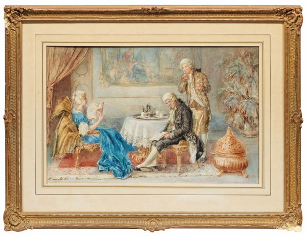 Subtil wiedergegebenes Interieur mit einer Rokokogesellschaft von zwei Herren und einer Dame vor einer Kaffeetafel. Aquarell und Gouache/Papier, kaschiert auf leichtem Karton. R. u. sign. und dat. "J. (oder Y.) Fillippi (19)42". Passepartoutausschnitt 33,8 cm x 53 cm. Rahmen.