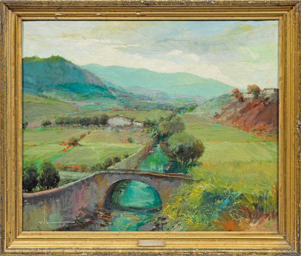 Farbintensive, in lockerem Duktus gemalte Landschaftsimpression des katalanischen Malers, der bei Ramón Muntaner García Morales und Jaime Muxart studierte und seine Werke mit "Vilmon" signierte. Öl/Lwd.; L. u. sign.; 50,5 cm x 61 cm. Rahmen.
