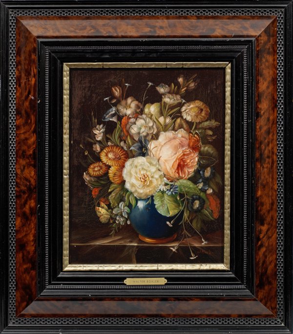 Feinmalerisches, in subtiler Detailtreue ausgeführtes Kabinettbild in der Tradition des 18. Jahrhunderts. Öl/Holzplatte. R. u. sign.; 30 cm x 24 cm. Rahmen.