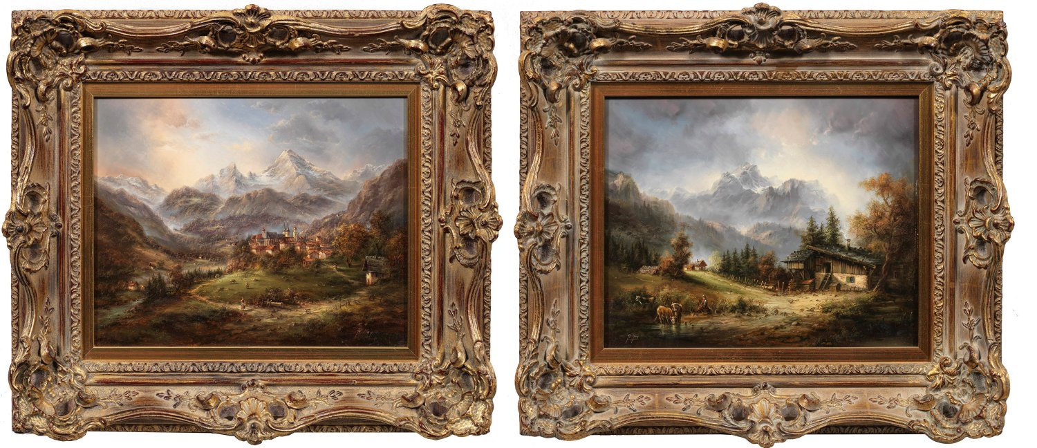 A pair of alpine landscape paintings. Oil on wooden panel, each signed.