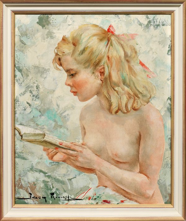 Mit breitem, pastosem Duktus und in lockerer, spätimpressionistischer Manier gemalte Darstellung eines jungen Mädchens, versunken in einem Buch. Stil- und motivtypisches Werk Talwinskis, der zunächst an der Warschauer Kunsthochschule und nach 1945 an der Académie de la Grande Chaumière in Paris studierte, stellte 1951 zum ersten Mal im Salon des Artistes Français in Paris aus. Öl/Lwd.; L. u. sign.; 55 cm x 46 cm. Rahmen.
