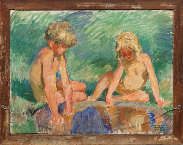 Oil on masonite. Indistinctly signed and dated (19)49. Study of two children in a landscape on the reverse.
