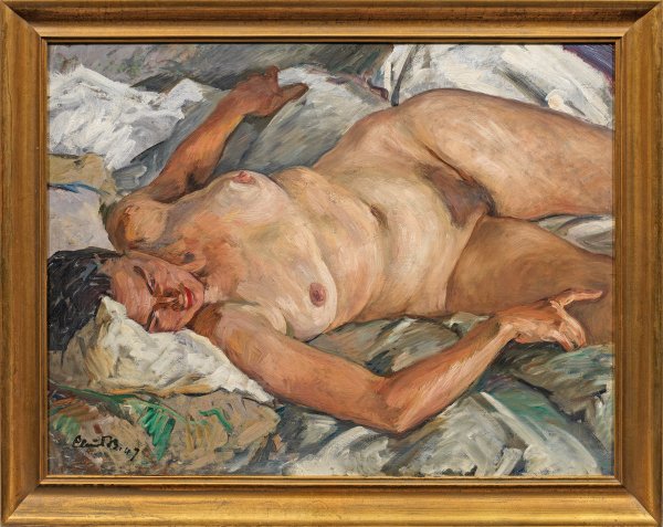 In kraftvollem liegender Akt, expressivem Duktus und leuchtender Farbigkeit gemaltes Bildnis eines liegenden, weiblichen Aktes. Öl/Masonitplatte. L. u. undeutl. sign. und datiert (19)49. Verso Ölstudie zweier in Landschaft sitzender Kinder, diese von fremder Hand bez.; 60 cm x 79,5 cm. Rahmen.