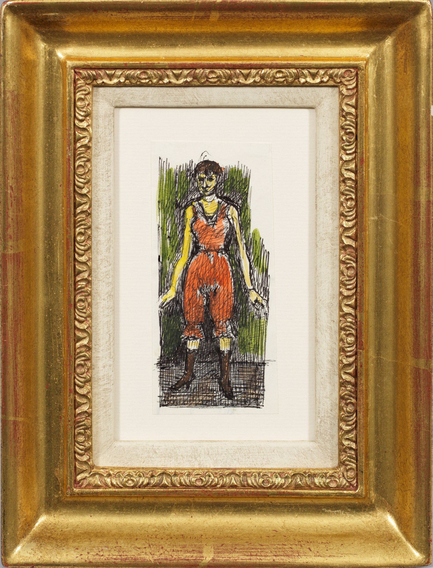 Dynamisch gezeichnete Darstellung einer Dirne in Dessous und Stiefeln. Aquarellierte Tuschzeichnung/Papier. Verso Nachlassstempel "Nachlass Fritz Burkhardt München". Ca. 12,2 cm x 5,6 cm. Rahmen.