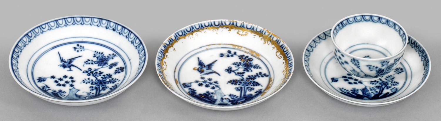 4-tlg.; Koppchen und drei Unterschalen. Sog. Fels- und Vogeldekor in unterglasurblauer Malerei, teilw. Reste von Überdekoration mit C-Schnörkeln und Punktrücken. Umlaufende Innenrandbordüre mit Eierstab. Schwertermarke in doppelten Ringlinien. Teilw. Blaumalerzeichen. Teilw. minim. best.; Schwertermarke. H. 4 cm D. 12 cm - 13 cm.