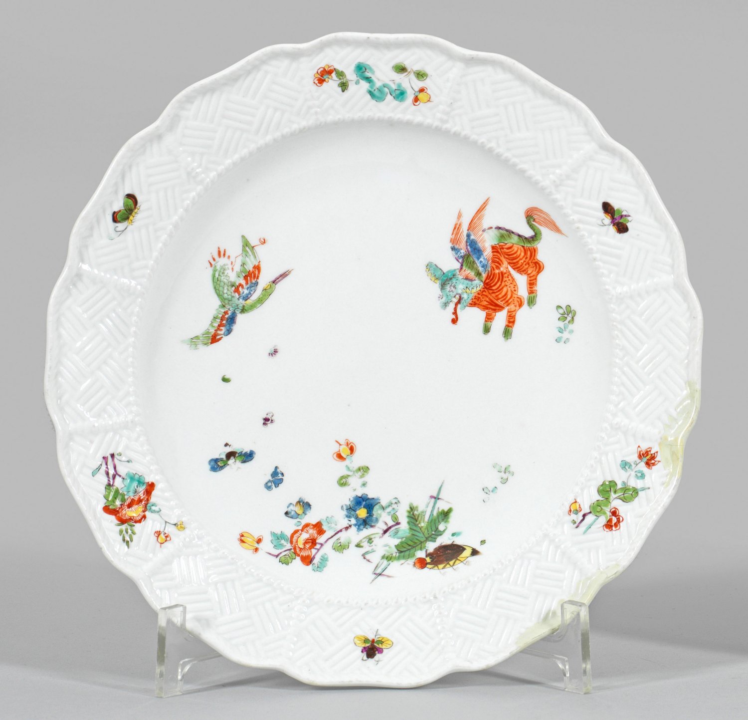 Runde Form. Reliefdekor "Sulkowski". Im leicht vertieften Spiegel sog. "Koreanischer Löwe" unweit eines fliegenden Reihers, Päonienzweige, Gräser, Farne sowie ein Maikäfer. Auf der Fahne Blütenzweige und Schmetterlinge. Polychrome Malerei im Kakiemonstil. Am Rand rest.; Schwertermarke. D. 23 cm.