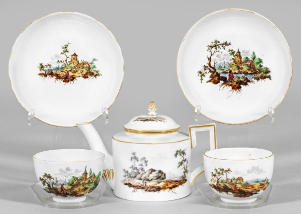 auf Untertassen. Auf der Wandung, Deckel und im Spiegel baum- und architekturbestandene, weite Landschaften mit Figurenstaffage in polychromer Malerei, wohl u.a. von Pascha Weitsch oder Arend August Hartmann. Goldstaffage. Dreher-Sign. Bö für Carl Heinrich Böcker. Manufakturmarken. H. 5 cm - 10,5 cm.
