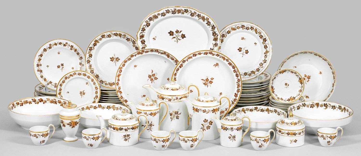 48-tlg.; 3 Kaffeekannen, Teekanne, Milchkännchen, 2 Zuckerdosen, 6 Tassen mit Untertassen, Brotteller sowie 6 Vorspeisen-, 12 Speise-, 8 Suppenteller, Anbietplatte, 7 Anbietschalen. Rund-, Zylinder- bzw. Becherform mit Band- bzw. Camapanerhenkel. Sepiafarbener Weinlaubkranzdekor in Camaieumalerei mit Goldstaffage, teilw. goldradierter Dekor. 6 Speise- und ein Brotteller zudem mit Blütenrelief-Randbordüre. Dekor ger. abweichend. Teilw. best./minim. rest.; Manufakturmarken. Kannen-H. 12,5 cm - 20 cm. D. 21,5 cm - 28 cm.