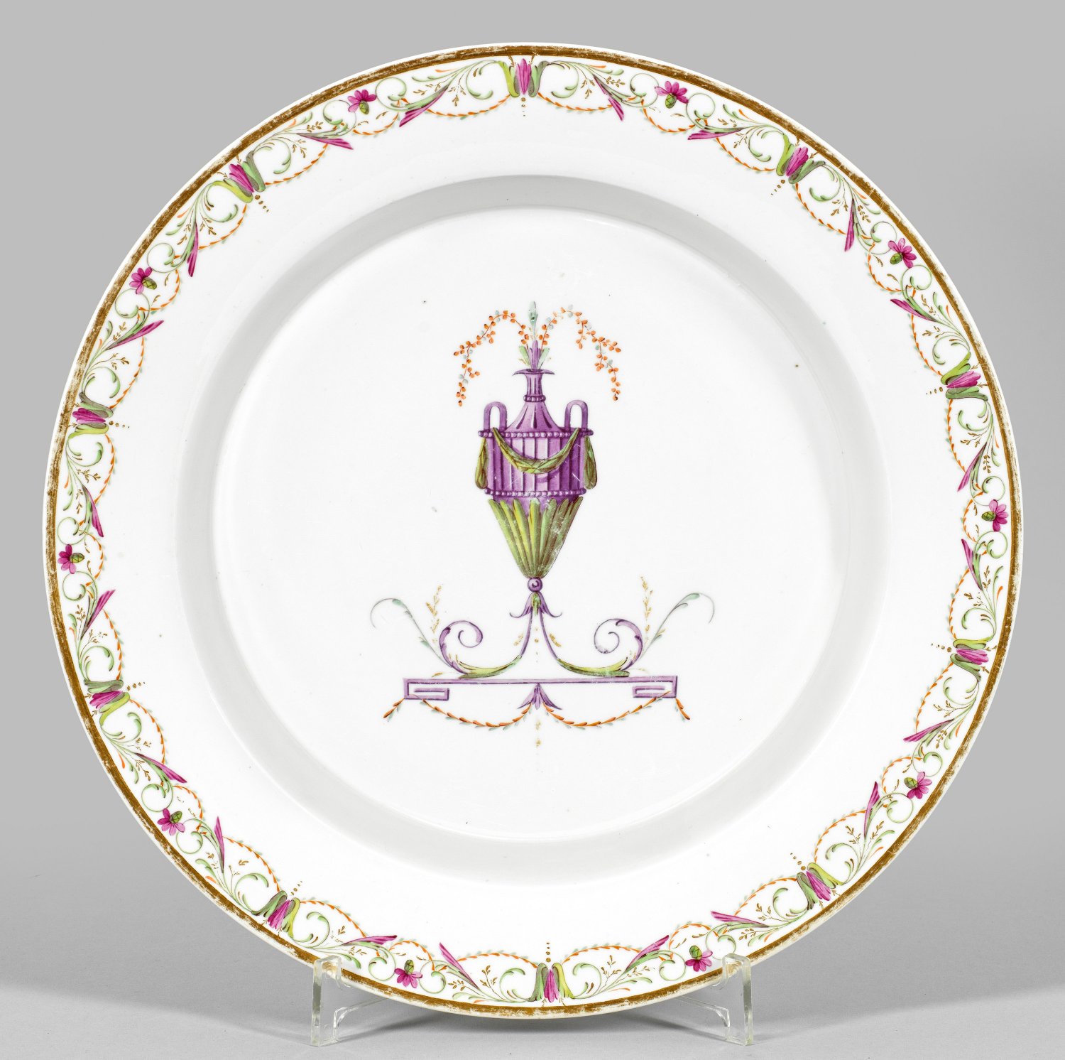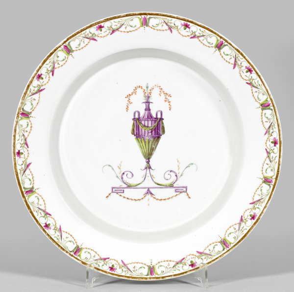 Runde gemuldete Form, glatter Rand. Im Spiegel eine fliederfarbene, von grüner Girlande behangene Vase mit farbigen Blütenzweigen über Mäanderkonsole. Umlaufend arabeske Blüten- und Rankenbordüre. Polychrome Malerei mit Goldhöhungen. Manufakturmarke. D. 34,5 cm.