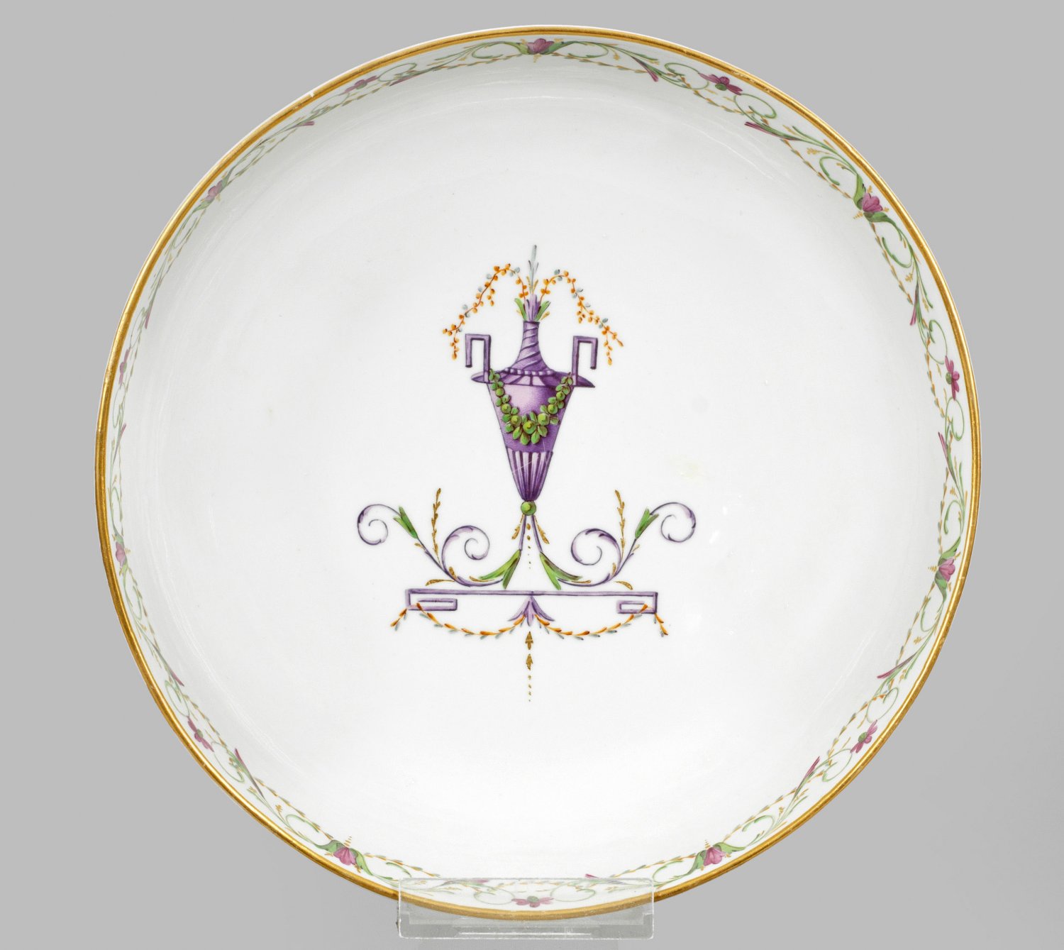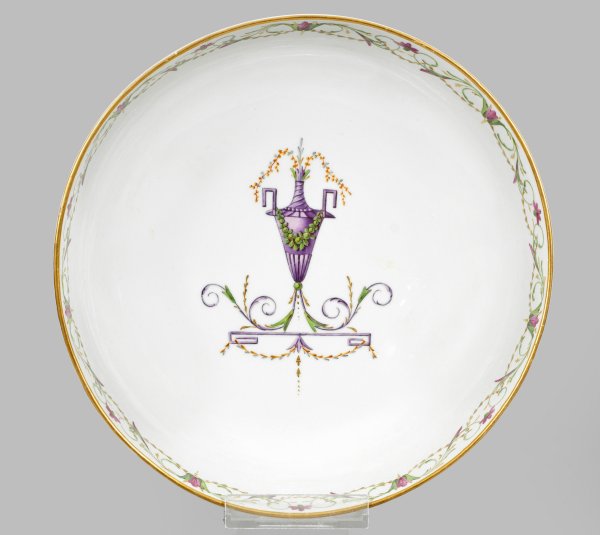 Runde gemuldete Form, glatter Rand. Im Spiegel eine fliederfarbene, von grüner Girlande behangene Vase mit farbigen Blütenzweigen über Mäanderkonsole. Umlaufend arabeske Blüten- und Rankenbordüre. Polychrome Malerei mit Goldhöhungen. Manufakturmarke. D. 20 cm.