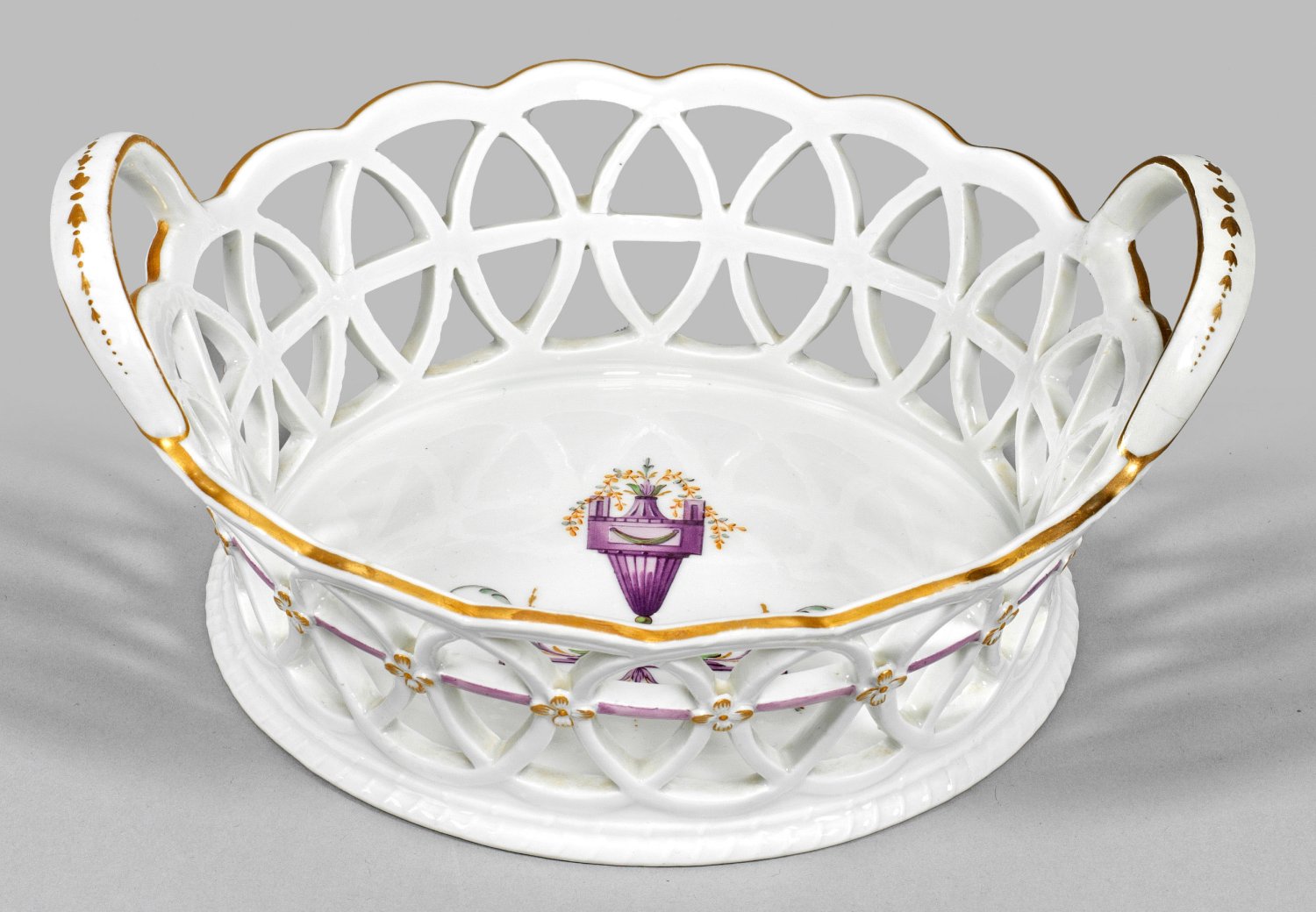 Runde gemuldete Form, wellenförmiger Rand, Bogenhenkel sowie kreisförmig durchbrochen gearbeitete Wandung mit Reliefblüten. Im Spiegel eine fliederfarbene, von grünem Tuch behangene Vase mit farbigen Blütenzweigen über Mäanderkonsole. Umlaufend arabeske Blüten- und Rankenbordüre. Polychrome Malerei mit Goldhöhungen. Unw. rest.; Manufakturmarke. D. 18 cm.