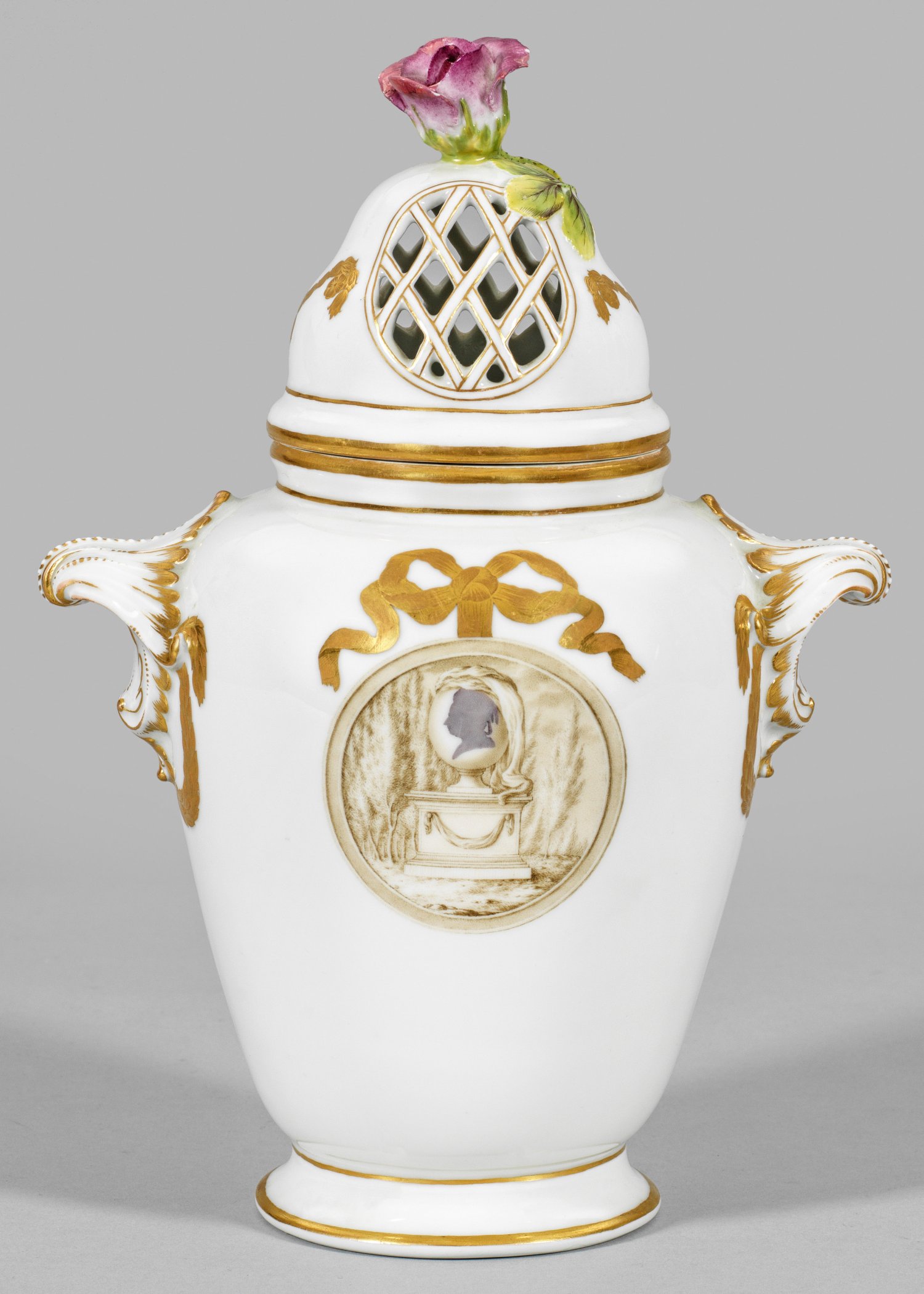 Ovoider Korpus auf ausgestelltem Rundfuß. Seitliche Handhaben als reliefplastische Blattrocaillen, behangen mit Goldfestons. Durchbrochen gearbeiteter, eingezogener Haubendeckel, mittig große plastisch aufgelegte, farbig staffierte Rosenknospe als Knauf. Beidseitig der Wandung, ein von Schleifen gehaltenes Medaillon mit Personifikation der Spes am Opferfeuer bzw. Graburne mit weiblicher Silhouette in Grisaillemalerei. Reiche Staffage aus Polier-und Radiergold. Geprägt "NO1". Unw. best./rest.; Manufakturmarke. H. 31 cm.