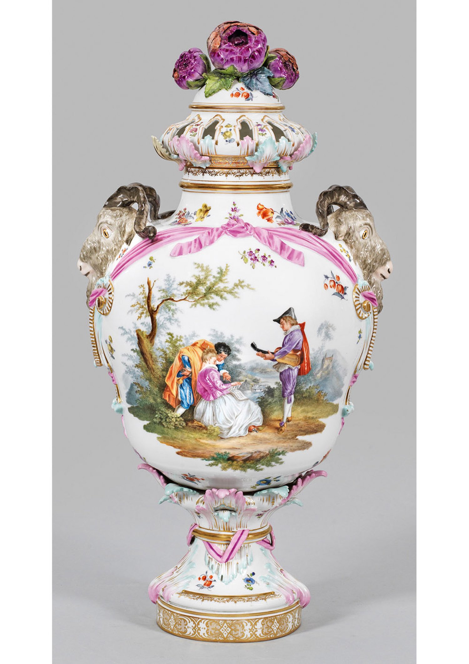 Auf hochgezogenem, von aufsteigenden Akanthusblättern reliefiertem Rundfuß balusterförmiger, leicht eingezogener Korpus, umzogen von rosafarbener Bandschleife. Seitlich große, plastische Widderköpfe über Akanthusblättern und Voluten. Gedrückt bauchiger, durchbrochen gearbeiteter Deckel mit großem Blütenknauf. Beidseitig der Wandung szenische Darstellung einer musizierenden Gesellschaft in baumbestandener Landschaft in der Art von Watteau bzw. großes sommerliches Blumenarrangement, umgeben von gestreuten Blüten. Umlaufende Goldornamentbordüren. Kleine Brandrisse. Rest.; Zeptermarke. H. 64 cm.