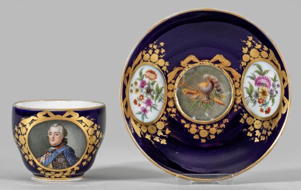 auf Untertasse. Runder, leicht eingezogener Korpus, seitlich gewundener Asthenkel. Form "Neuglatt". Kobaltblauer Fond. Auf der Wandung und im Spiegel runde, von Goldranken umzogene Reserven. Darin schauseitiges Bildnis Friedrich II., Landgraf von Hessen-Kassel mit blauer Schärpe und sichtbarem Hosenbandorden nach Gemälde von Johann Heinrich Tischbein d. Ä. von 1773 bzw. rücks. farbige Blumengebinde und Kriegsattribute. Polychrome Malerei. Goldstaffage. Zeptermarke. H. 6 cm.