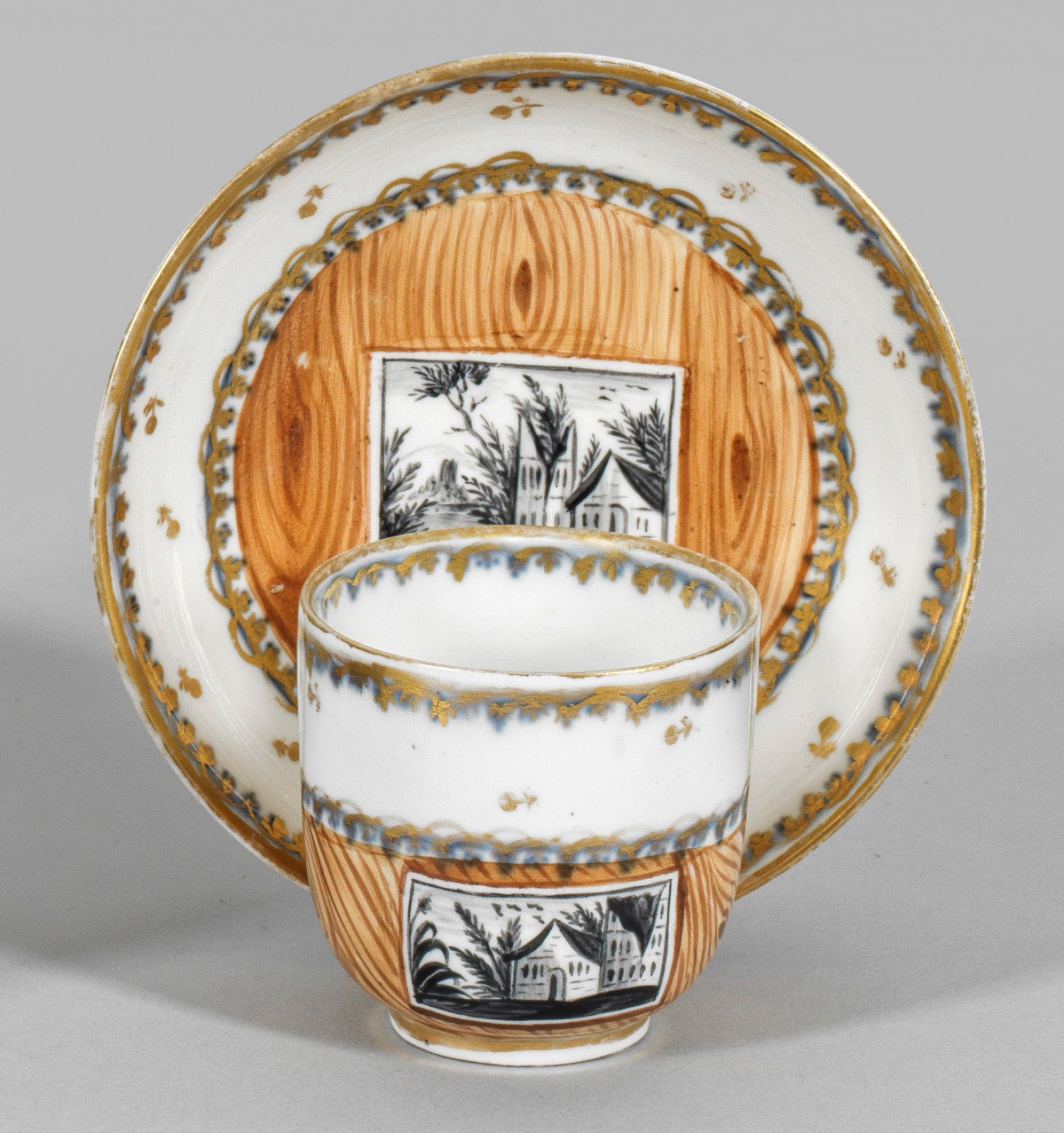 auf Untertasse. Becherform mit gekantetem Henkel. Unterglasurblauer Bordürendekor mit Überdekoration aus Holzmaserfonds und Landschaftsreserven in polychromer Malerei. Golddekor. Dat. (1)801. Manufakturmarke. H. 7 cm.