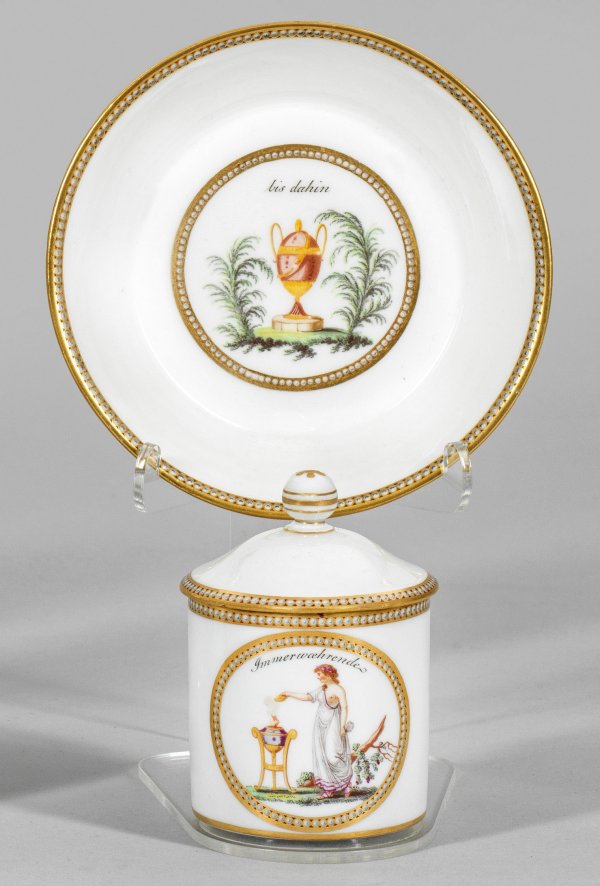 auf Untertasse. Zylinderförmig mit gekantetem Henkel. Schauseitig und im Spiegel, medaillongerahmte antikisierende Darstellung einer Dame, Öl ins Feuer gebend bzw. Vasenmotiv. Jeweils mit Inschrift "Immerwaehrende" bzw. "bis dahin". Polychrome Malerei. Umlaufende, goldkonturierte Perlschnurbordüren. Teilw. minim. best./Haarriss. Zeptermarke. H. 9 cm.