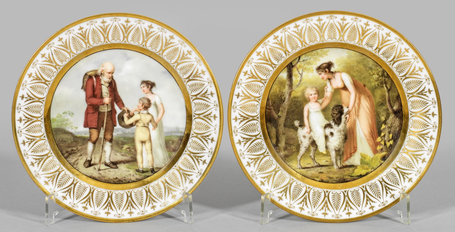 Runde Form. Im leicht vertieften Spiegel goldgerahmte Darstellung einer Dame in klassizistischer Gewandung und Haartracht, ein kleines Kind umgreifend, das auf einem gefleckten Cocker Spaniel sitzt bzw. eine Figurengruppe aus zwei Kindern mit Wanderer in weiter Wiesenlandschaft unter Wolkenhimmel in polychromer, valeurreicher Malerei. Die Fahne mit umlaufendem Palmettenfries im Rapport mit stilisierten Blüten in Poliergold. Maler-Sign. "Le Guay" für Charles Etienne Le Guay (1762 - 1846). Im Boden bez. "M. fre. de Dihl & Guerhard". D. 22 cm.