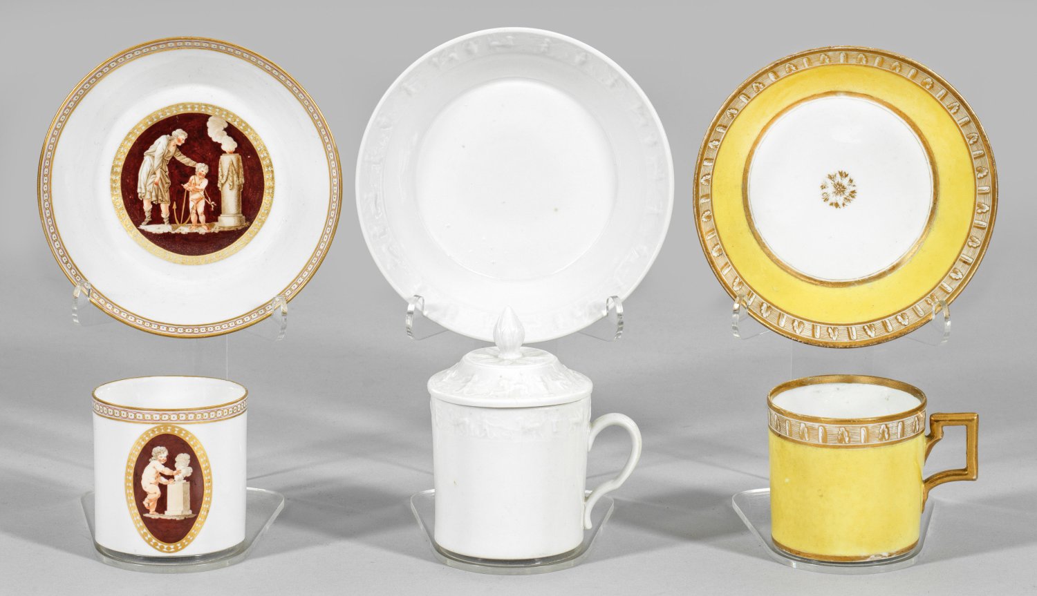 mit Untertassen, u.a. mit Deckel. Zylinderförmig, gekanteter bzw. ohrenförmiger Henkel. Dekor aus figürlichen Relieffriesen, medaillongerahmten, antikisierenden Darstellungen mit Putten in polychromer Malerei sowie zitronengelben Fondflächen. Teilw. Goldornamentbordüren. Teilw. minim. best.; Manufakturmarken. H. 6 cm - 6,5 cm.