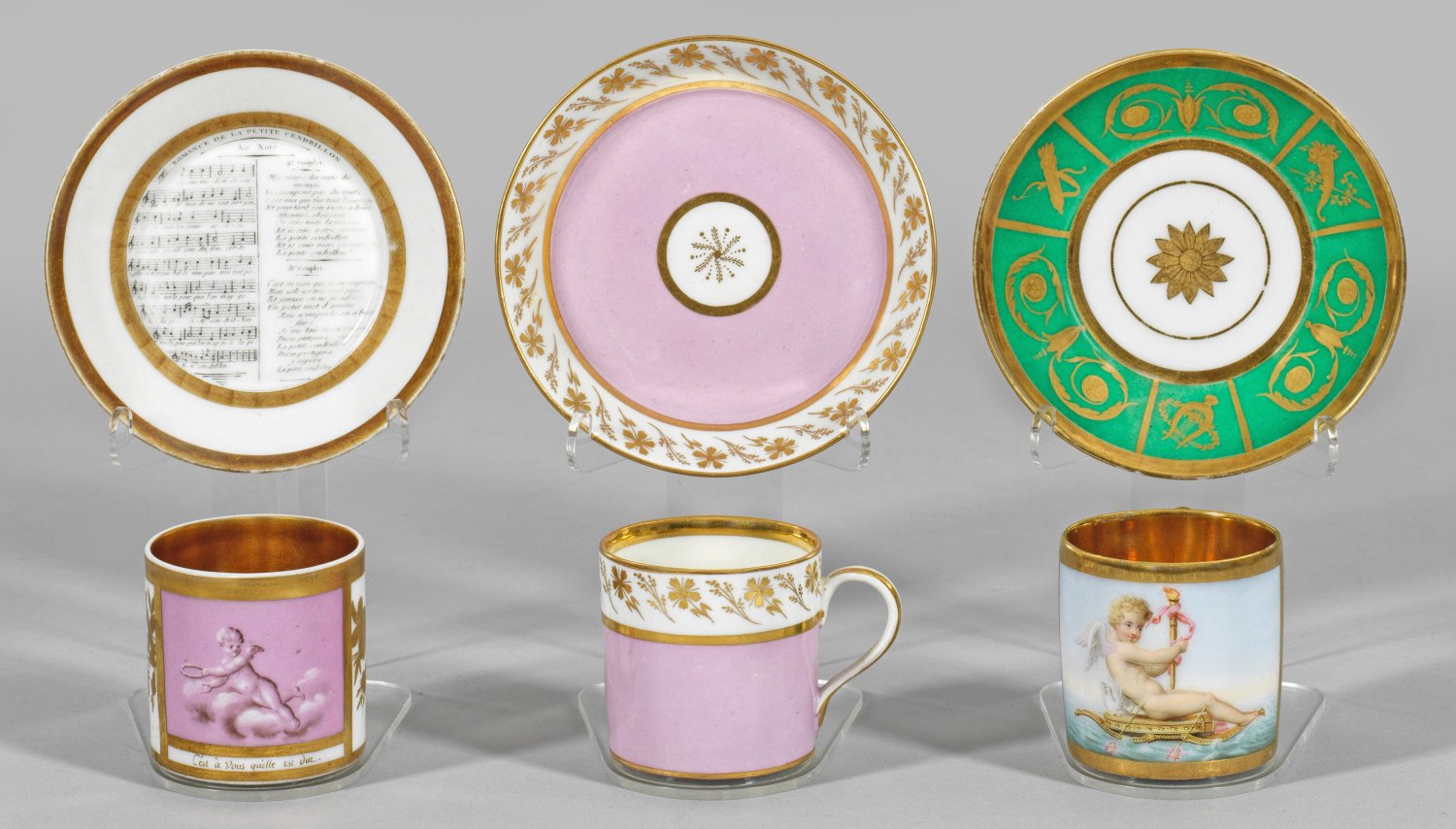 mit Untertassen. Zylinderform. Rosa- und smaragdgrüne Fonds, mit figürlichen Puttenszenen und Partitur "Romance de la Petite Cendrillon" und u.a. goldradiertem Dekor aus Blüten- und Rankenwerk. Teilw. dat. (1)824. Teilw. monogr. "B.S. a Paris"/Manufakturmarke. H. 6 cm.