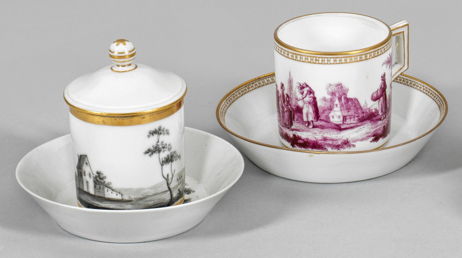 mit Untertassen. Zylinderform. Auf der Wandung und teilw. im Spiegel Genreszenen bzw. Landschaften in purpurfarbener Camaieu -und Schwarzlotmalerei, u.a. mit Galeriekante in Gold. Teilw. Manufakturmarke. H. 6,6 cm.