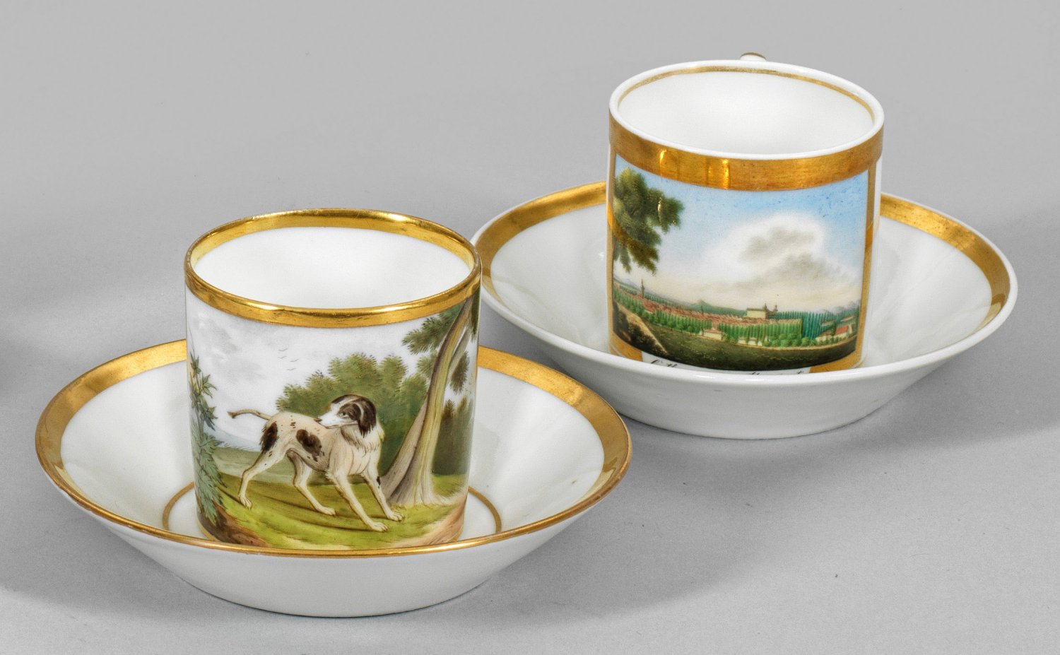 mit Untertassen. Zylinderförmig mit Ohrenhenkel. Schauseitig goldgerahmte Ansicht von "Gotha von der Abendseite" bzw. Darstellung eines Hundes in polychromer Malerei. Teilw. Manufakturmarke. H. 6 cm.