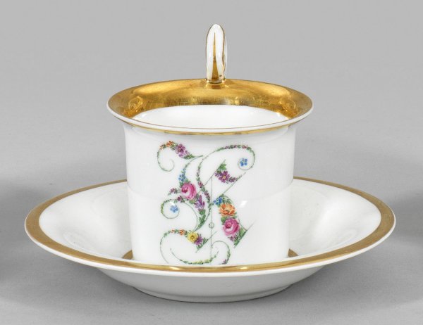 auf Untertasse. Konisch leicht ansteigender Korpus, ausschwingender Rand und Rosettenhenkel. Schauseitiges, aus Blumenranken geformtes Monogramm in poylchromer Malerei. Goldstaffage. Schwertermarke. H. 8 cm.