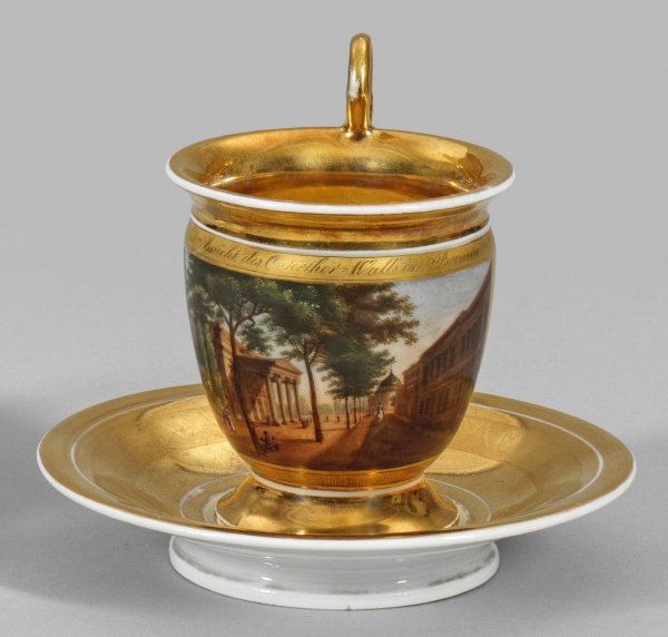 A Biedermeier gold-decorated porcelain cup and saucer with view of Bremen.