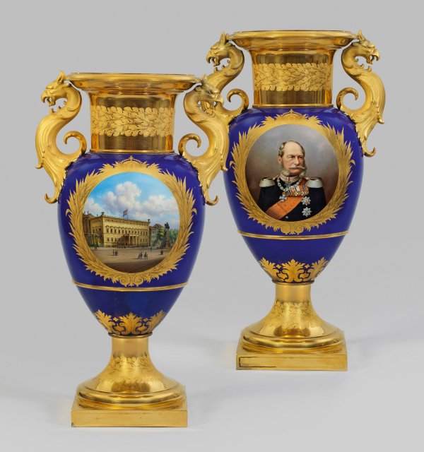 sog. "Französische Vase". Hochgezogener Rundfuß auf quadratischer, vergoldeter Plinthe. Ovoider Korpus mit zylindrischem Hals und ausladendem, profiliertem Lippenrand. Seitlich s-förmig geschweifte, von großblättrigem, plastischem Akanthus aufsteigende Greifenkopfhenkel aus Biskuitporzellan. Auf der Schauseite, in leuchtend königsblauem Fond, goldradiertes Medaillon aus Pfeifenstab und dichten Lorbeer- und Akanthuszweigen, gehöht durch die Deutsche Kaiserkrone. Darin Ansicht des Palais des Prinzen und späteren Kaiser Wilhelm I. von Preußen, sog. "Altes Palais" unter den Linden mit gehisster Standarte und Figurenstaffage, davor das Denkmal Friedrich des Großen, seitlich die Nationalbibliothek. Nach einem Stahlstich von Albert Henry Payne (1812-1902) und einer Zeichnung von Alexander Carse. Rückseitig, in gleichförmiger Rahmung, das Halbfigurenbildnis Wilhelm I. von Preußen als Deutscher Kaiser in Uniform, mit einer Reihe hoher Orden nach einer Reprofotografie in Grau-Camaieu. Äußerst feine polychrome Malerei. Reiche Vergoldung und radierte Goldmalerei. Form-Entw. Karl Friedrich Schinkel. Minim. best.; Rest.; Zepter- und Pfennigmarke sowie Malereimarke. H. 69 cm.