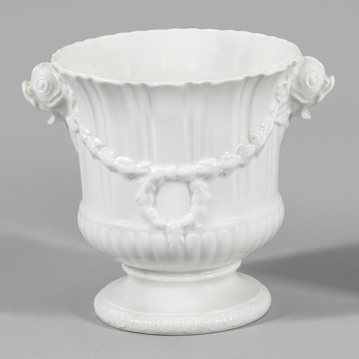A porcelain cachepot with laurel garlands and dolphin's head handles. Small firing cracks. Sceptre mark.