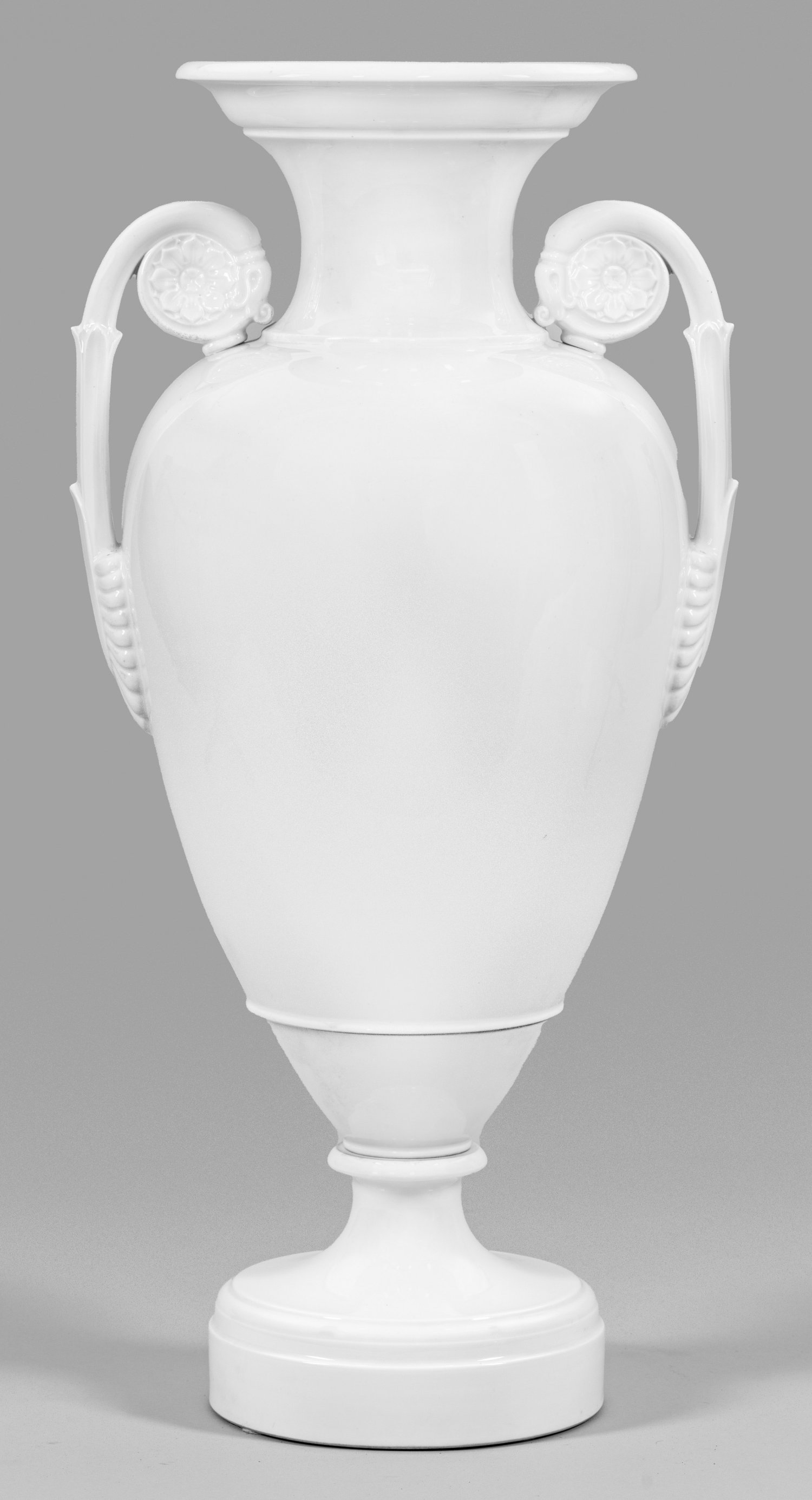 Weißporzellan. Amphorenförmiger Korpus auf profiliertem Rundfuß. Seitlich hochgezogene, am Ansatz von aufgelegten Palmetten aufsteigende, eingerollte Rosettenhenkel. Entw. Karl Friedrich Schinkel, um 1820 - 1830. Jahresbuchstabe. Zeptermarke. H. 69 cm.