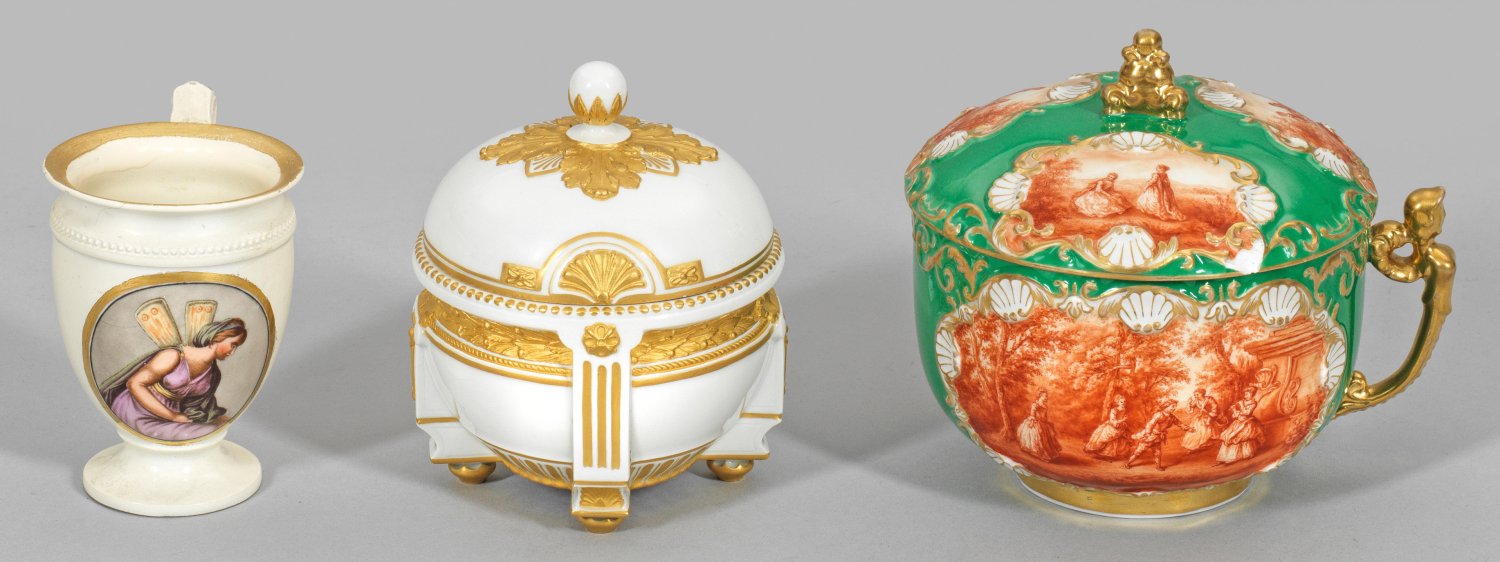 Runder Korpus mit Kugelknauf-Deckel auf vier Füßen, vertikal gegliedert durch teilw. kannelierte Pilaster. Umlaufend feiner, goldstaffierter Reliefdekor aus Blatt-, Blüten- und Fächerwerk. Jahreszeichen. Zepter- und Malereimarke. Beigabe: Biedermeier-Ziertasse (Schwertermarke, Meissen) sowie große Grünfond-Deckeltasse mit Watteauszenen in eisenroter Camaieu. Teilw. besch./rest.; 19. Jh.; H. 9 cm - 13 cm.