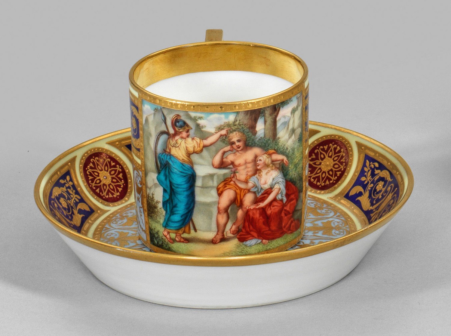 A Vienna style porcelain cup and saucer with gold decoration in relief and mythological scene "The choice of Heracles". Manufacturer's mark.