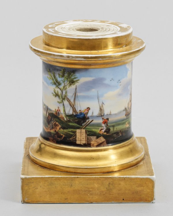 Auf quadratischer Plinthe profilierter Rundsockel mit umlaufender Darstellung einer Hafenszene in polychromer Malerei. Kreisförmiger Durchbruch an der Deckplatte. Wohl Standfuß für Vase. Reiche, partiell radierte Poliervergoldung. Ber.; H. 20 cm.