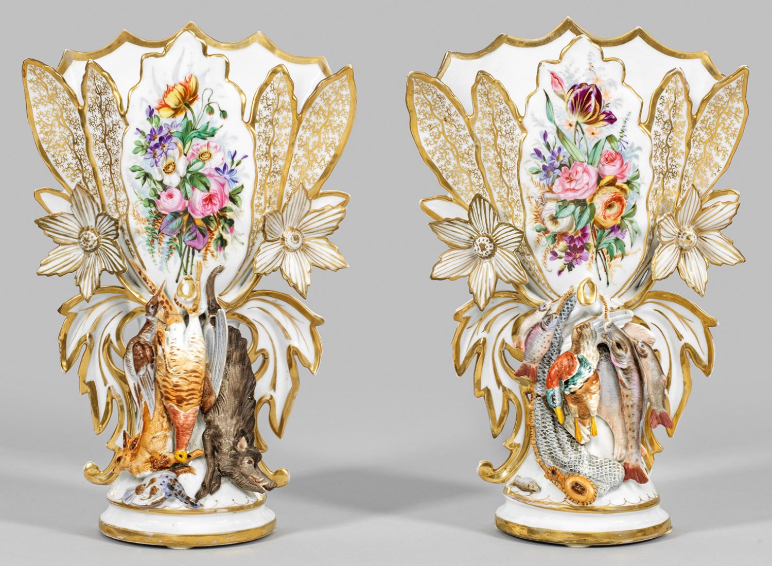 Teilw. Biskuitporzellan. Über gekehltem Rundfuß flacher, sich kelchblattförmig erweitender Korpus. Schauseitig üppiger, plastischer Dekor aus erlegten Jagdtieren und Fischen mit großen Blüten und Blättern sowie feiner Blumenmalerei. Reiche Goldstaffage. Brandrisse. Teilw. rest.; H. 42 cm.
