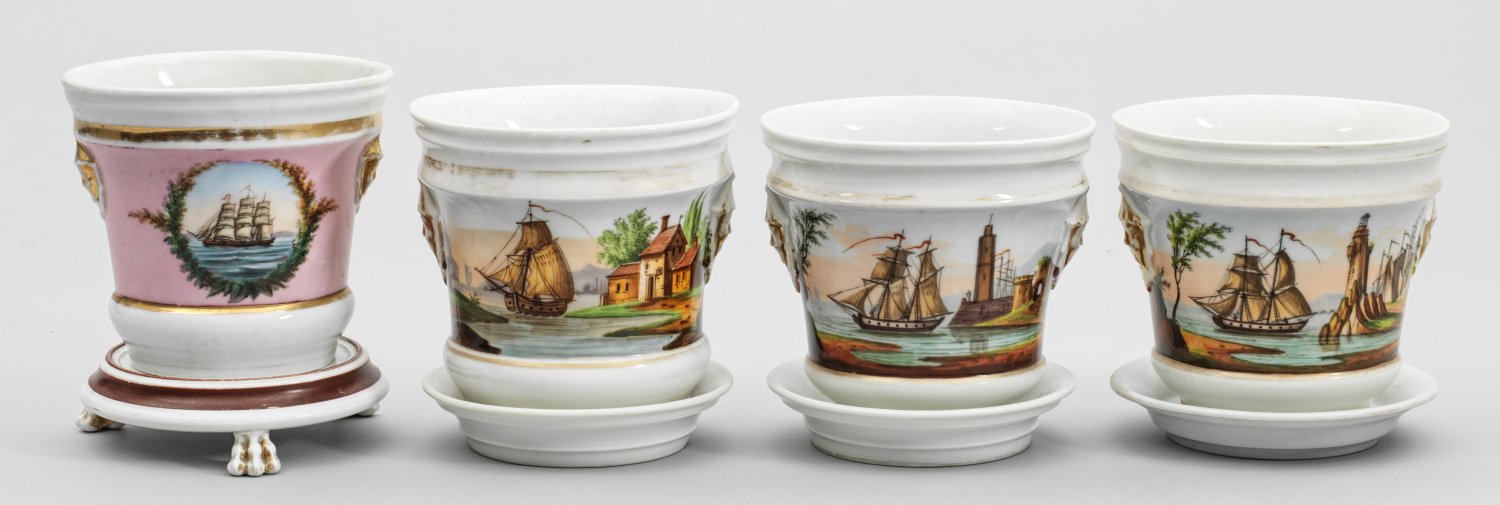 mit Untertellern. Konische Form. Umlaufend der Wandung Darstellungen von architekturbestandenen Küstenlandschaften mit Schiffen. Polychrome Malerei mit Goldstaffage. Teilw. ber./rest.; H. 17 cm - 20 cm.