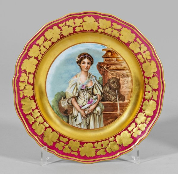 Runde Form mit passig geschweiftem Rand. Auf der Fahne relieferte Weinlaubbordüre, im Spiegel goldgerahmte Darstellung eines Mädchens mit Krug vor einem Brunnen nach Jean-Baptiste Greuze. Hausmaler-Sign. R. Grohs. Schwertermarke. D. 22 cm.