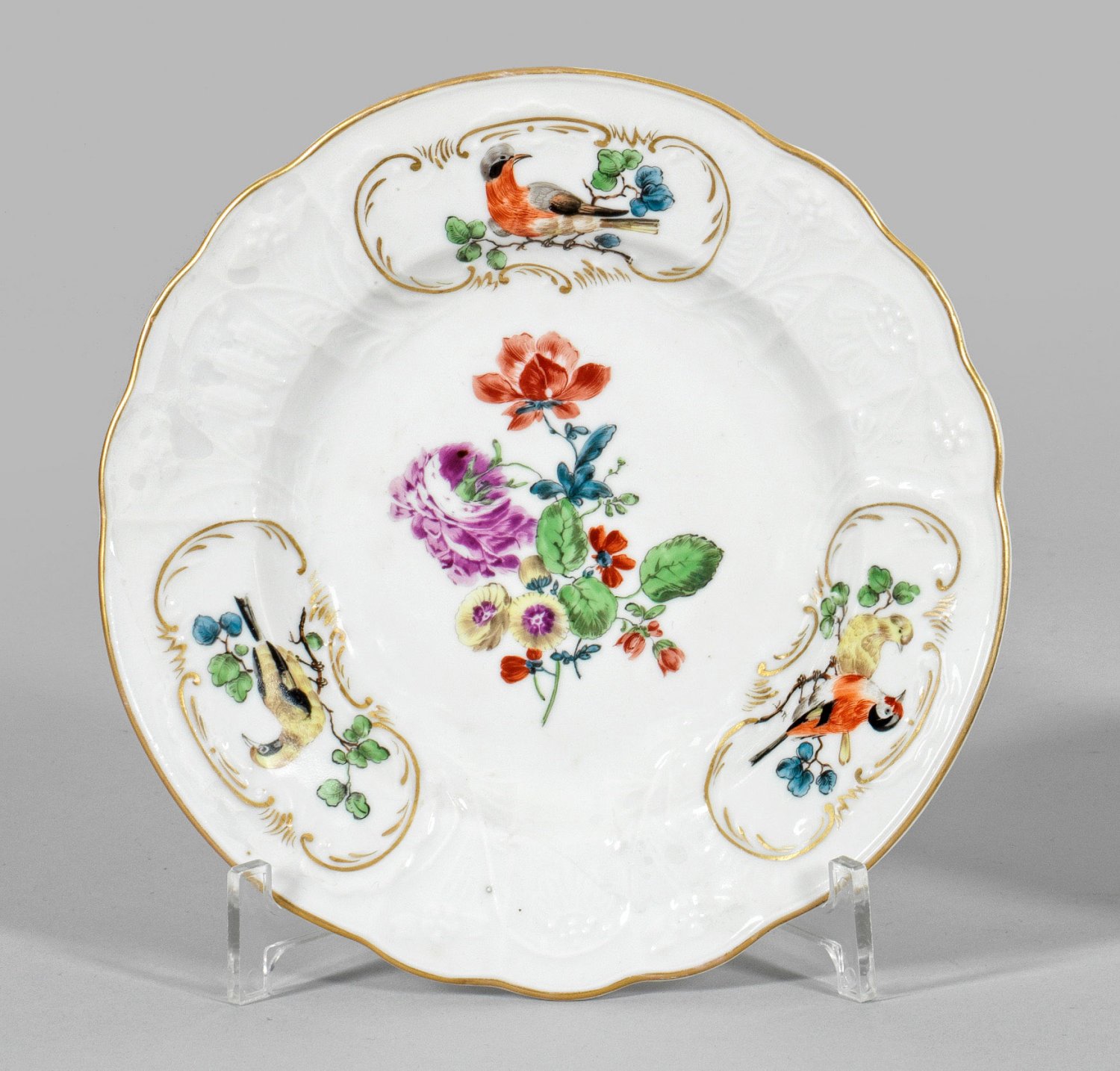 Rund mit passigem Rand. "Dulong"-Relief. Im leicht vertieften Spiegel farbenfrohes Blumengebinde, auf der Fahne Vogelmotive in Rocaillerahmung. Polychrome Malerei mit Golddekor. Rest.; Schwertermarke. D. 21 cm.
