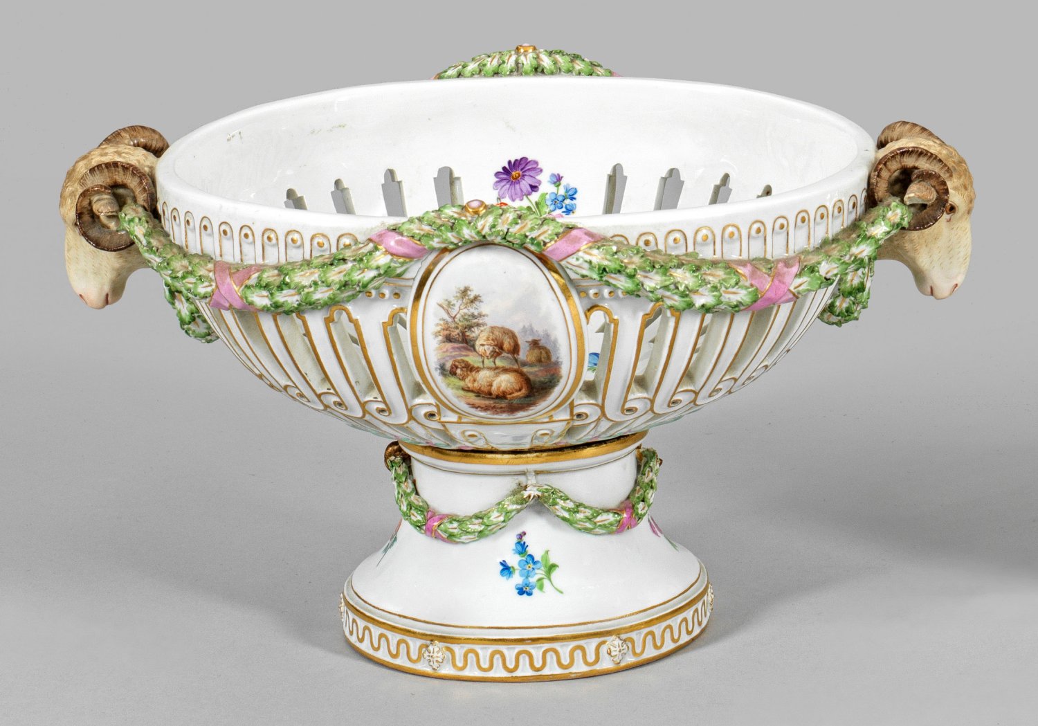 Hochgezogener, ornamentierter Fuß mit ovalem, durchbrochen gearbeitetem Korpus, umzogen von plastischen Eichenlaubfestons. Seitliche Widderkopf-Handhaben. Beidseitig der Wandung aufgelegte Ovalmedaillons mit Darstellung weidender Schafe in Landschaftskulisse. Fuß und Innenwandung mit Streublumendekor und Blumengebinde. Polychrome Malerei mit Goldstaffage. Minim. rest./best.; Schwertermarke. H. 18 cm. 31 cm x 22 cm.