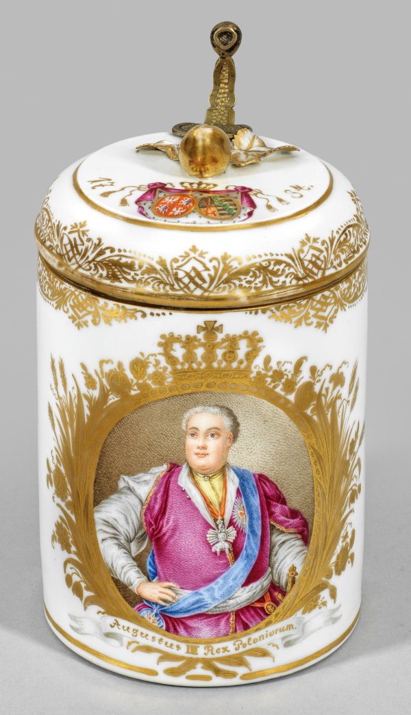 Zylinderförmiger Korpus, rückseitig ohrenförmiger Bandhenkel. Messingmontierter, flach gewölbter Deckel mit plastischem Früchteknauf. Auf der Schauseite eine goldradierte, von Blüten und Rankenwerk umzogenen Ovalreserve mit Königskrone. Darin das Bildnis von König August III. in polnischer Tracht mit blauer Schärpe und sichtbarem Orden vom goldenen Vlies sowie Orden des Weißen Adlers, unterhalb bez. "Augustus III. Rex Poloniorum". Ausschnitt nach dem berühmten Gemälde von Louis de Silvestre von 1737. Auf dem Deckel das bekrönte Allianzwappen von Sachsen-Polen-Litauen mit Jahreszahl 1784. Polychrome Malerei mit Goldspitzenbordüre. Manufakturmarke. H. 18,5 cm. D. 11,5 cm.