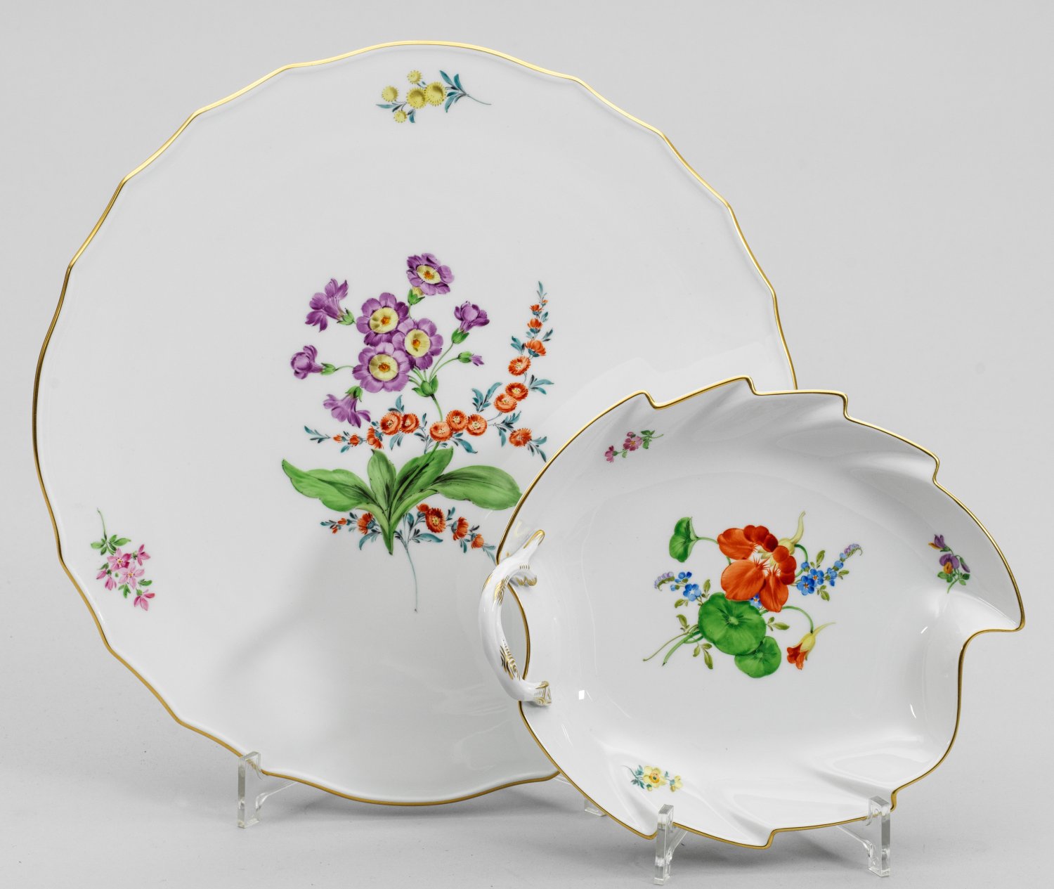 Runde bzw. blattförmige Form. Farbenprächtige Blumenmalerei mit Goldstaffage. Schwertermarke. D. 32,5 cm. 20,5 cm x 19,5 cm.