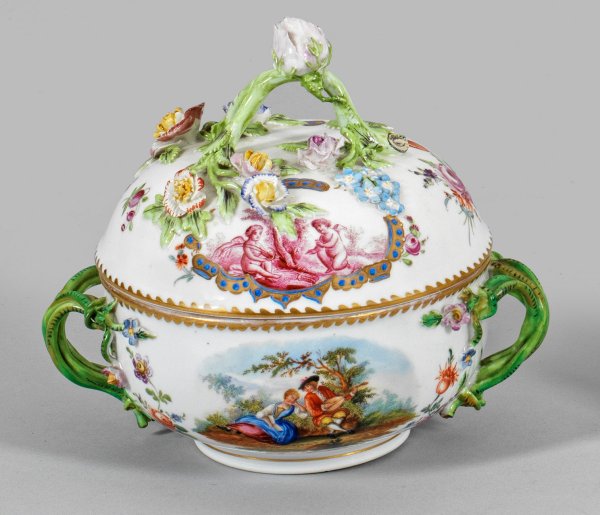Halbkugeliger Korpus. Seitlich gewundene Asthenkel mit plastischen Blütenranken. Gewölbter Deckel mit Rankenknauf, in Blumenbelege übergehend. Auf der Wandung Liebespaare in Landschaft und auf dem Deckel kartuschengerahmte Amoretten. Polychrome und Purpur Camaieumalerei. Umlaufender Goldrand als Zahnkante. Unw. best.; Manufakturmarke. H. 16 cm. D. 15 cm.