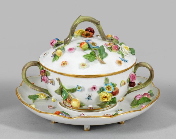 auf geschweiftem, von kurzen Astfüßen getragenem Presentoir. Halbkugeliger Korpus mit gewölbtem Deckel, astförmige Henkel. Allseitig belegt mit plastischen Blumen-, Früchtebuketts und gestreuten Blüten im Wechsel mit Insektendekor. Polychrome Malerei mit Goldrand. Unw. rest.; Schwertermarke. H. 12 cm. D. 11,5 cm - 18,5 cm.
