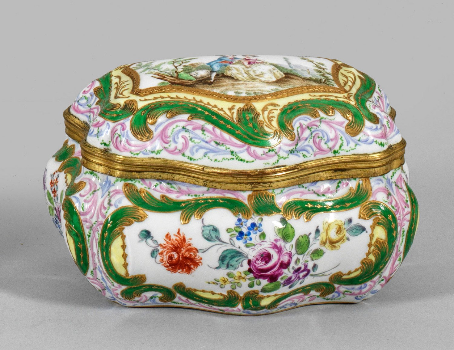 Bombierter Korpus mit gewölbtem, messingmontiertem Scharnierdeckel. Auf der Wandung, von grünen Rocaillen und kleinen Blütenzweigen gerahmte Blumenbuketts, auf dem Deckel Watteauszene mit Schäferpaar in bukolischer Landschaft. Polychrome Malerei und partielle Reliefgoldhöhungen. H. 11cm. 16 cm x 11 cm.