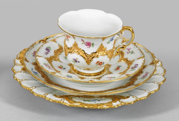 3-tlg.; B-Form. Kaffeetasse mit Untertasse, Kuchen- und Anbietteller. Teilw. geripptes Muschelrelief. Streublumen- und Früchtedekor in polychromer Malerei. Goldstaffage und Goldbronze. Manufakturmarken. Tassen-H. 8 cm. D. 16,5 cm - 23 cm.
