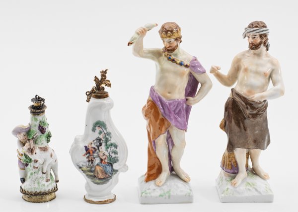 A 4-piece porcelain lot with a pair of mythological figures and two perfume bottles. Partly restored/minor chipped. Partly sceptre mark.