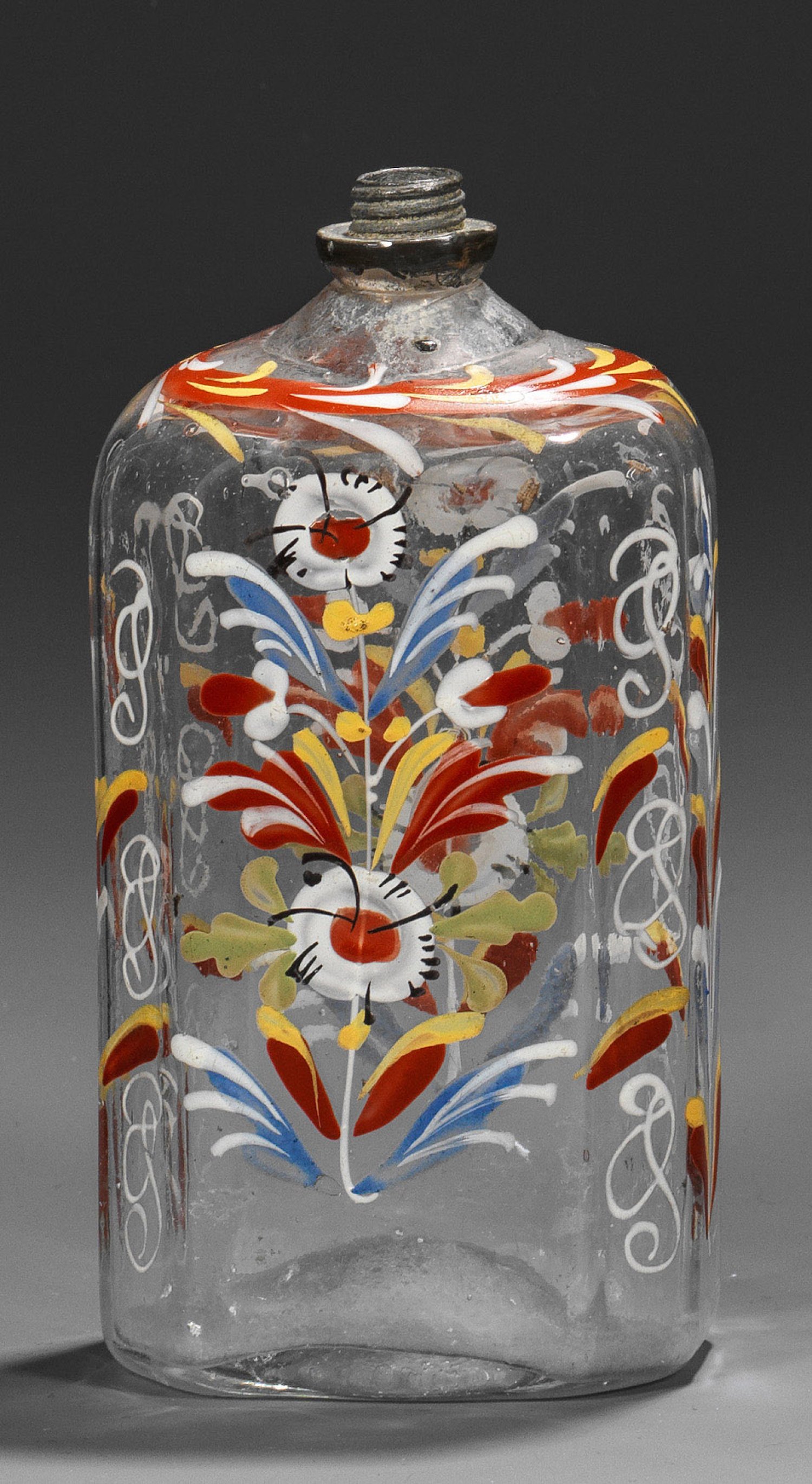 Farbloses, leicht graustichiges Glas mit Abriss im Boden. Querrechteckige Form mit abgeschrägten Ecken, gerundeter Schulter und zinnmontierter Mündung. Polychromer floraler Dekor in opaker Emailmalerei. H. 13,5 cm.