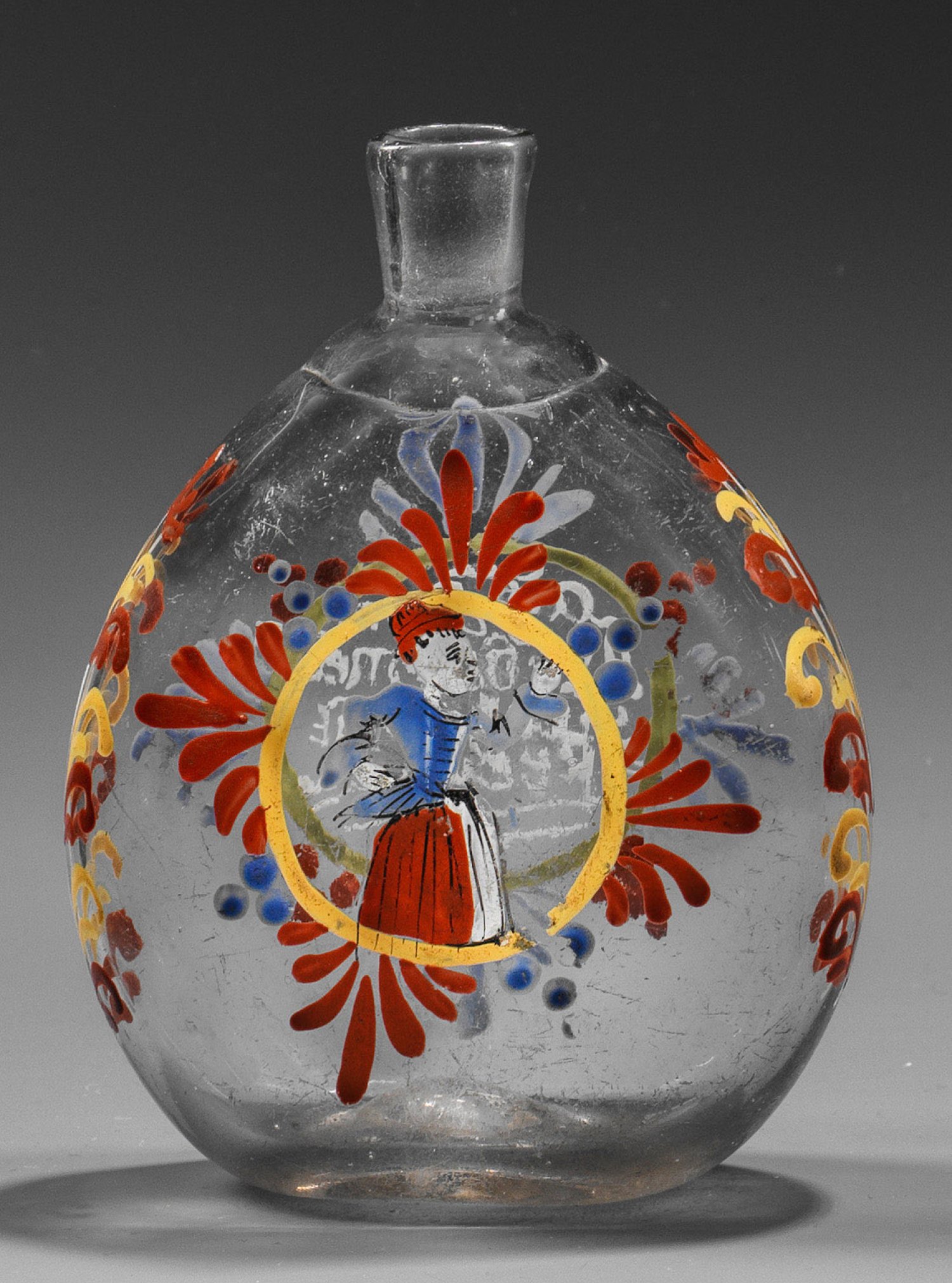 Farbloses, leicht graustichiges Glas mit Abriss im Boden. Tropfenform, abgesetzte Mündung, kurzer Hals. Polychromer Dekor in opaker Emailmalerei aus zwei gerahmten Rundmedaillons mit Bildnis einer stehenden Frau bzw. Sinnspruch, an den Schmalseiten je eine Blattranke. H. 12 cm.