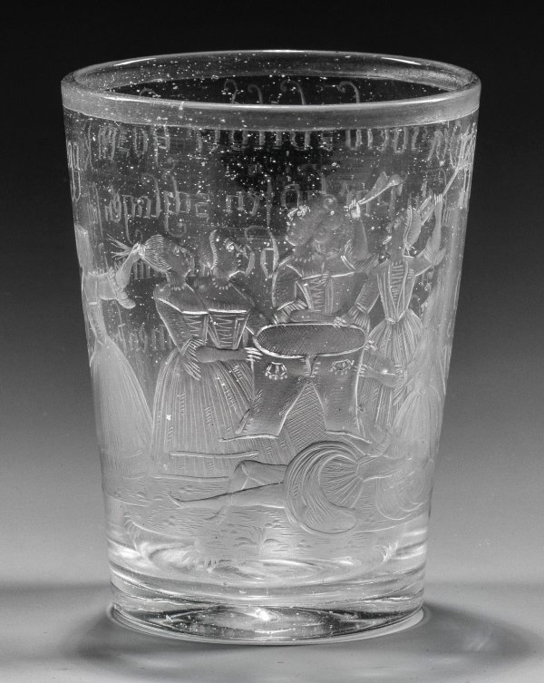 Farbloses Glas, ausgeschliffener Abriss. Leicht konische Form. Mattgeschnittener Dekor. Schauseitig szenische Darstellung mit sieben, sich um eine Männerhose zankende Frauen, rücks. korrespondierender Spruch ''Der weibsbilder hosen krieg umb ein par hosen schlagen sich hier sieben weiber jämmer lich weil keinen man sie könen kriegen müssen die hosen sie ver gnügen''. H. 11,8 cm.
