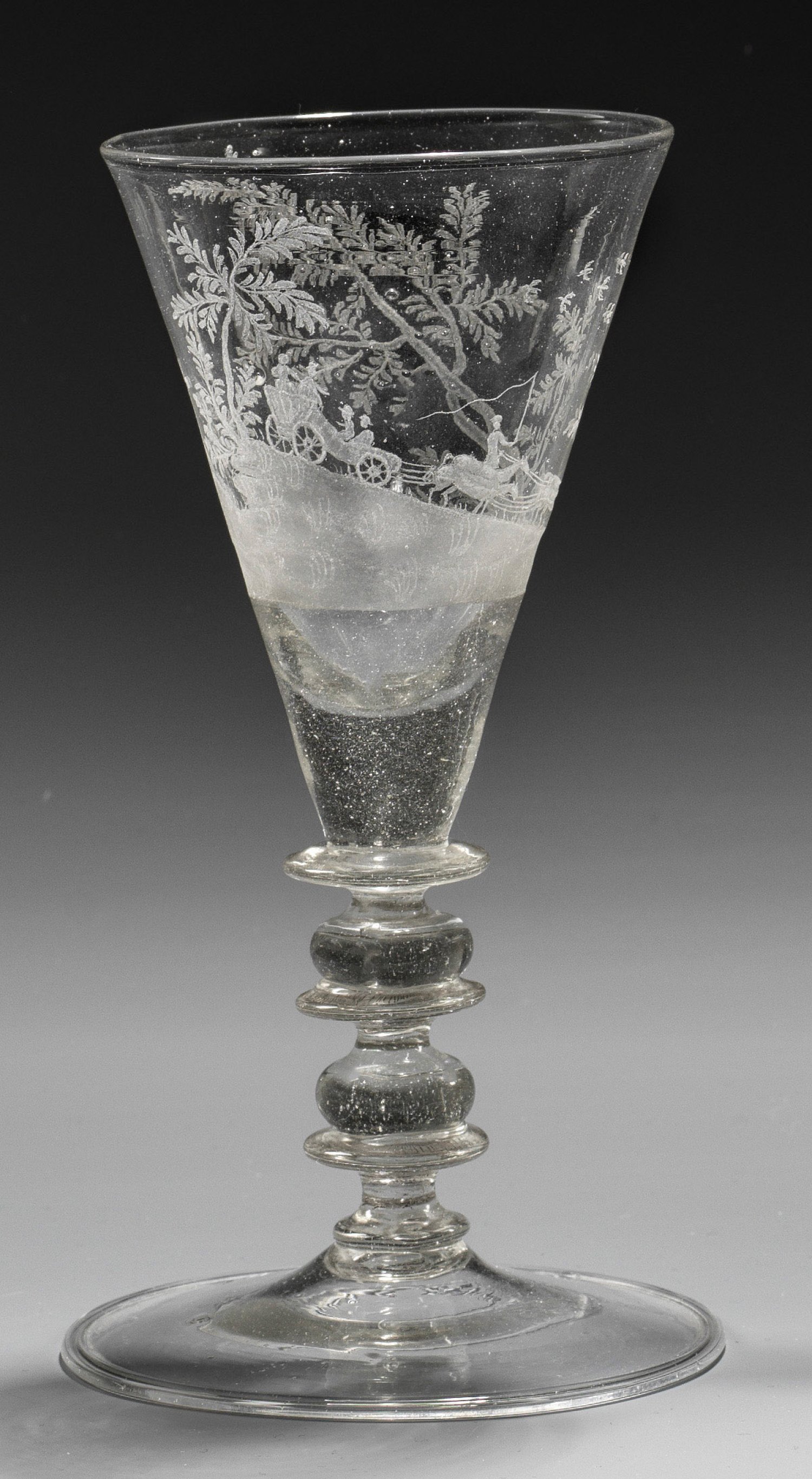 Farbloses, leicht graustichiges Glas. Leicht ansteigender Scheibenfuß mit Abriss und umgeschlagenem Rand, reich gegliederter Schaft aus zwei gedrückten Kugelnodi zwischen Ringscheiben. Auf der konischen, trichterförmigem Kuppa umlaufender Dekor in Diamantriss und Mattschnitt aus einer felsigen, baumbestandenen Landschaft mit Gesellschaft in einem Vierspänner, einem Reiter und einem Wanderer. H. 17,5 cm.
